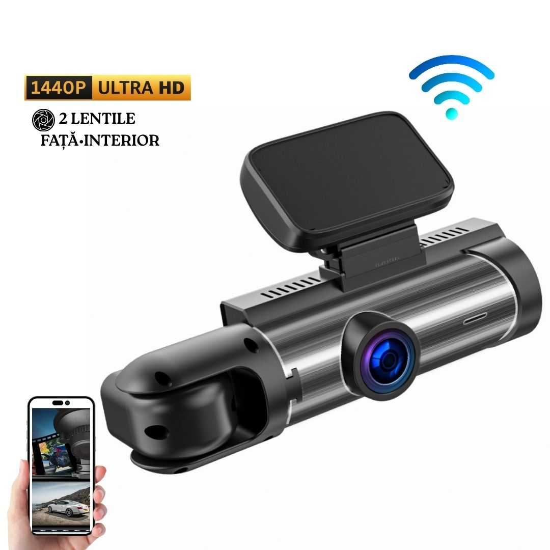 Camera Auto De Bord 2in1 CLAUSTEEL DVR Camera High PRO Ultra HD 1440P, Wireless, 2 Lentile Fata-Interior, Unghi Ultra-Larg De 170°, Display 3.16", Night Vision HD, Inregistrare Dubla, Loop Recording, G-sensor, Detectare Miscare