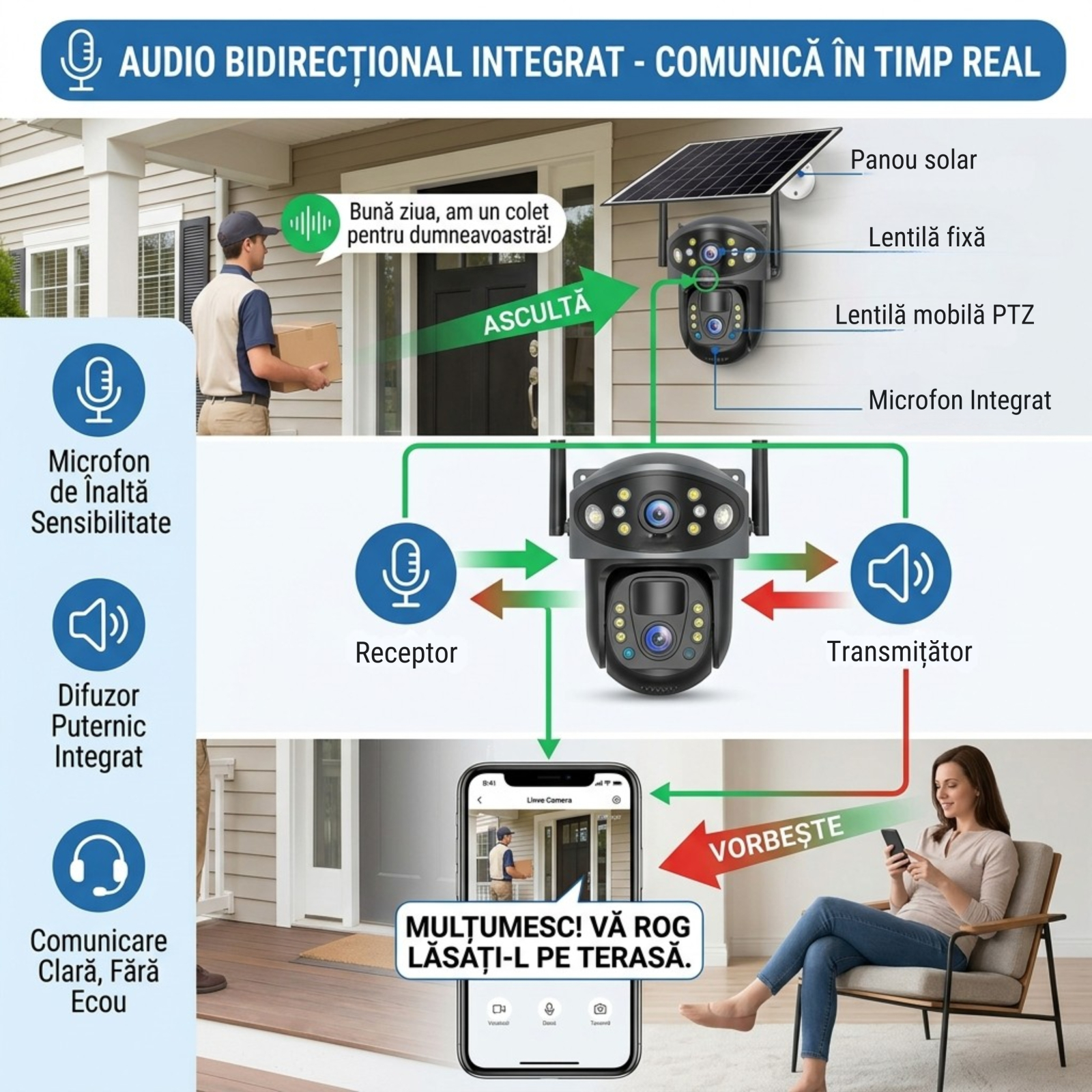 Camera este dotată cu microfon de înaltă sensibilitate și difuzor integrat, permițând comunicarea directă cu persoanele din zona monitorizată.