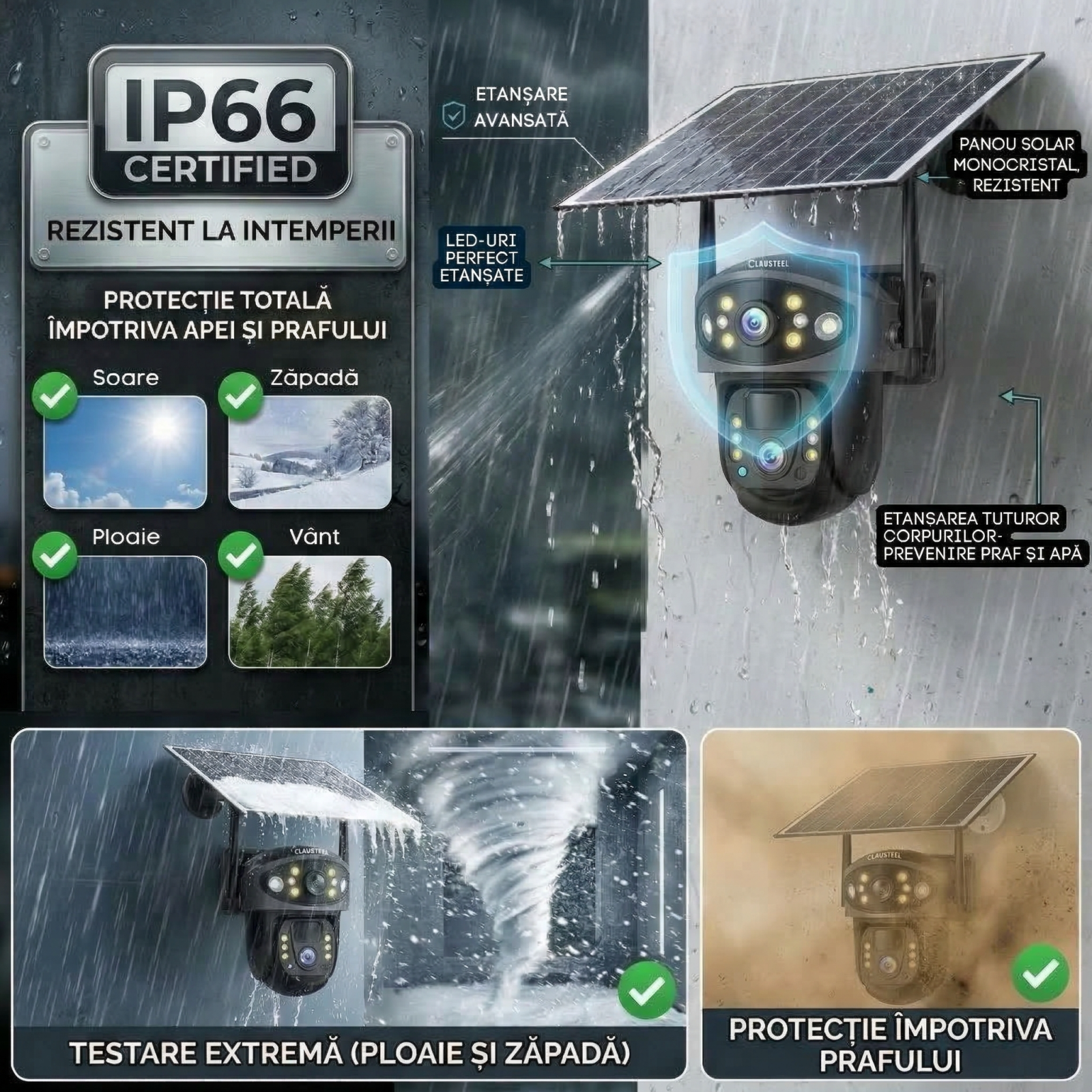 Camera de supraveghere CLAUSTEEL 2-în-1 cu două lentile și rezoluție 6MP oferă o soluție completă de securitate pentru locuințe, curți, cabane, ferme sau alte spații izolate. Datorită alimentării solare, conectivității 4G și detectării inteligente a persoanelor, camera funcționează independent de WiFi și monitorizează proprietatea în permanență.