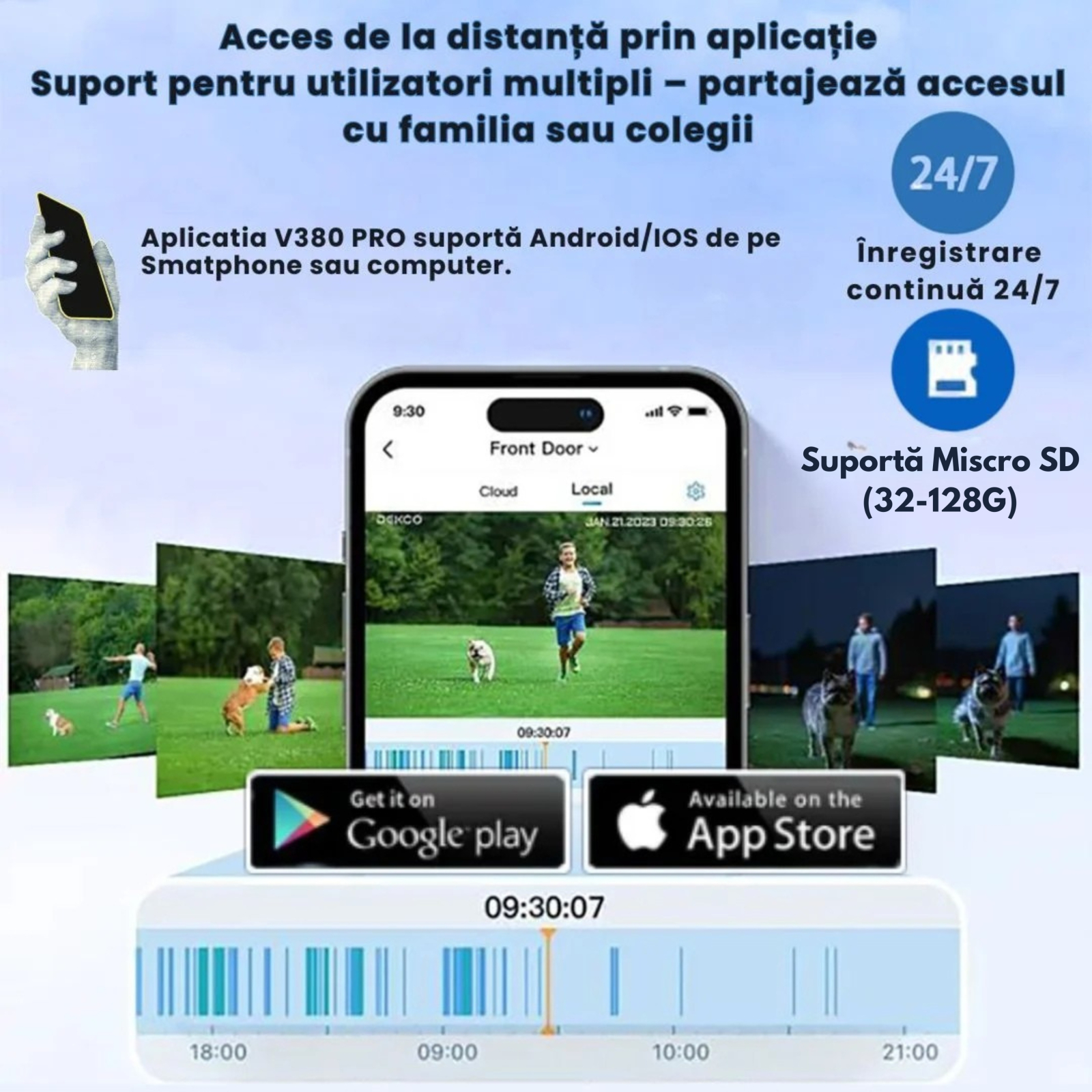 Camera se conectează rapid la aplicația V380 Pro, oferindu-vă control complet direct de pe telefon.