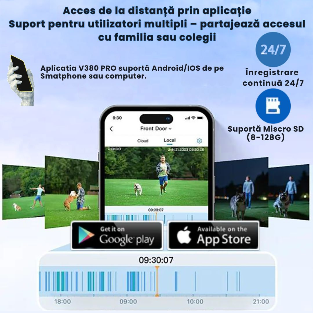 Camera are slot pentru cartela SIM 4G, compatibila cu orice retea din Romania (Vodafone, Orange, Digi, Telekom). Nu ai nevoie de Wi-Fi sau cabluri – conecteaza-te de oriunde, direct din aplicatia mobila.