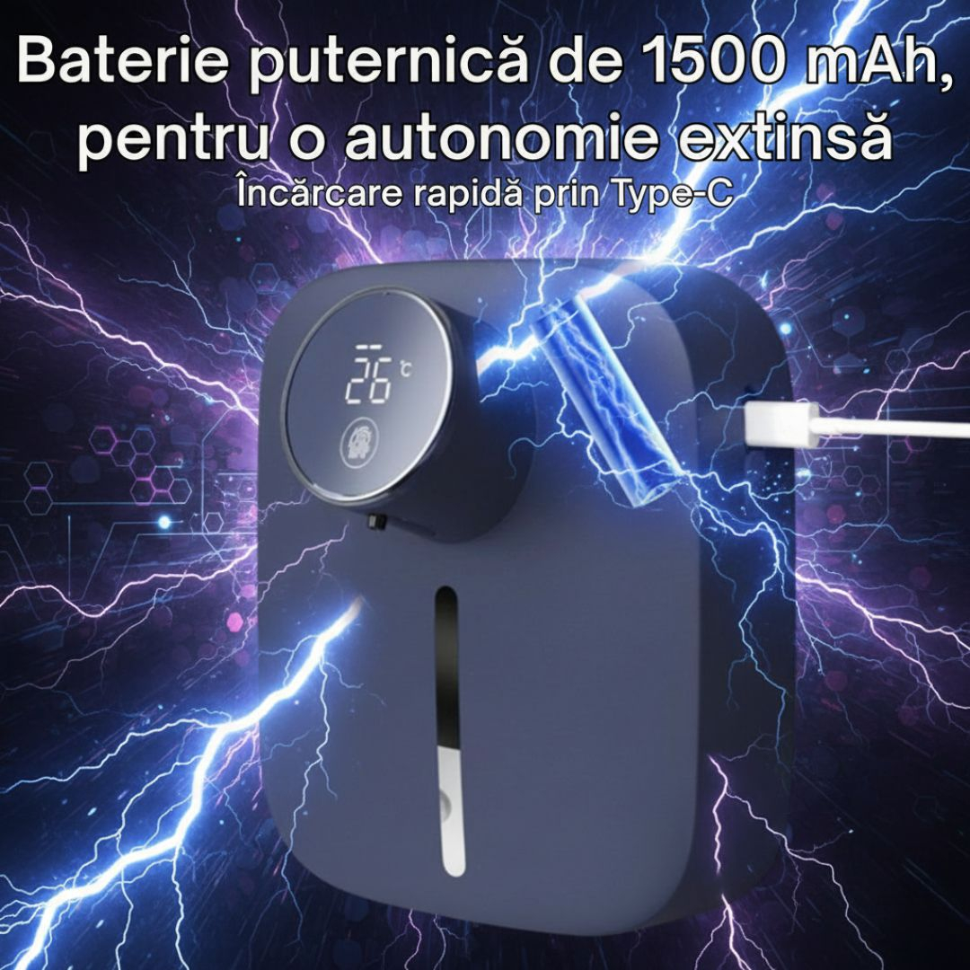 Dozatorul e ultra-higienic, fără atingere, se activează instant când aduci mâna. Afișajul LED e foarte util: vezi temperatura și dacă mai ai spumă.