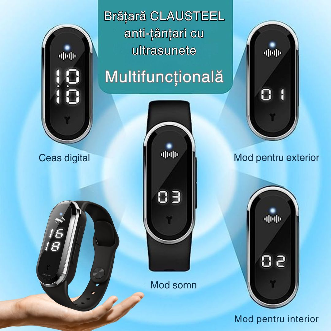 Bratara anti-tantari cu Ultrasunete si Ceas Digital, Design Modern, Anti-insecte, Incarcare USB, Rezistenta la apa, Unisex, negru