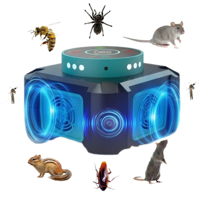 Aparat profesional cu ultrasunete CLAUSTEEL cu 4 difuzoare si lumini intermitente, anti insecte, anti rozatoare, anti sobolani, furnici, gandaci, frecventa variabila in functie de daunatori, 25kHz-65k
